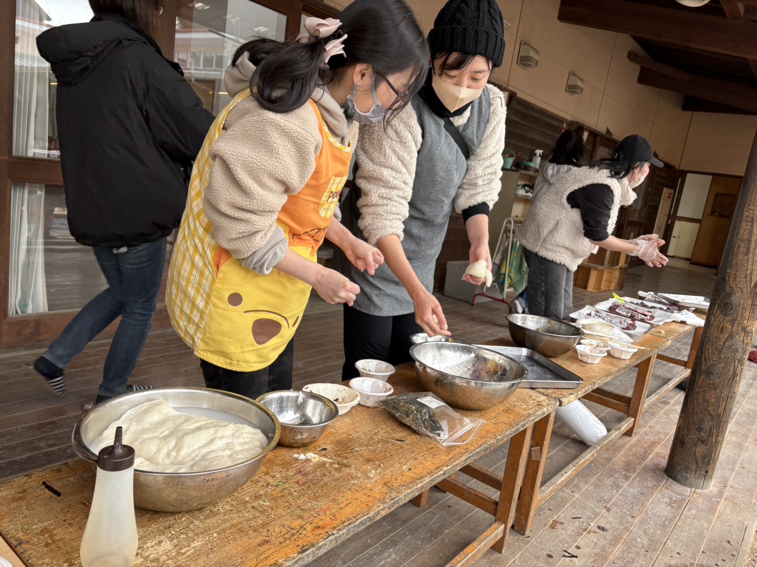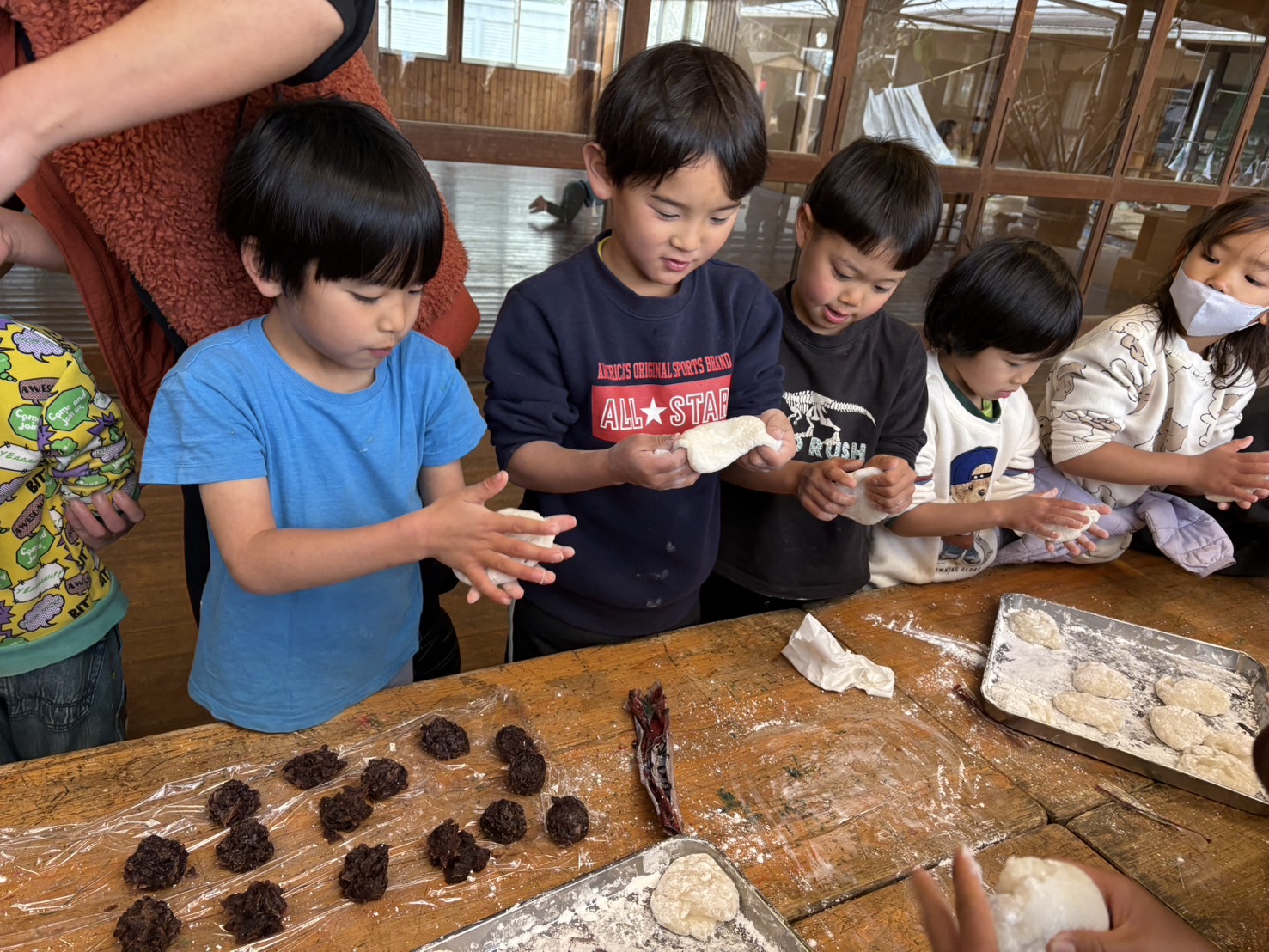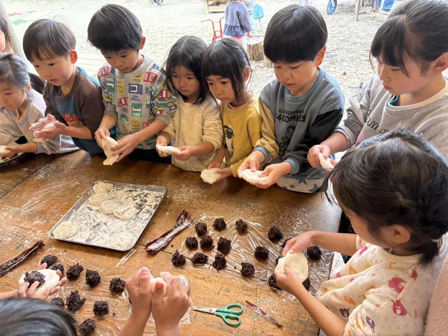 ぞう組さん、くま組さんは、お餅を伸ばして餡子を入れて、自分の大福を作りました。