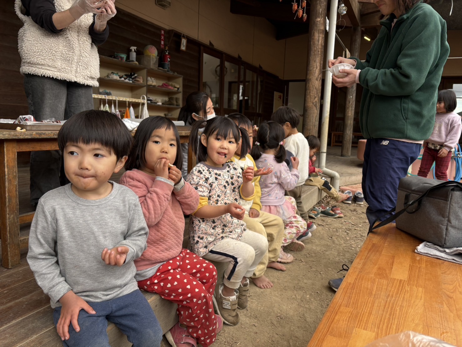 ついたお餅は、お母さんたちが餡子やきなこ、醤油などで、美味しく味付けしてくれて、子どもたちは、廊下に座って「おいしー!!」と食べる姿がかわいいです。