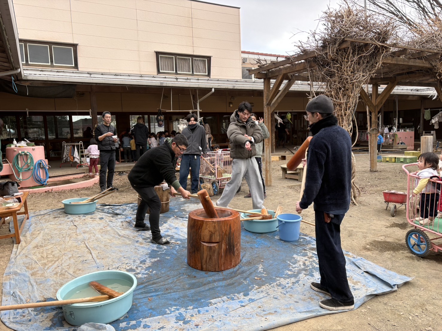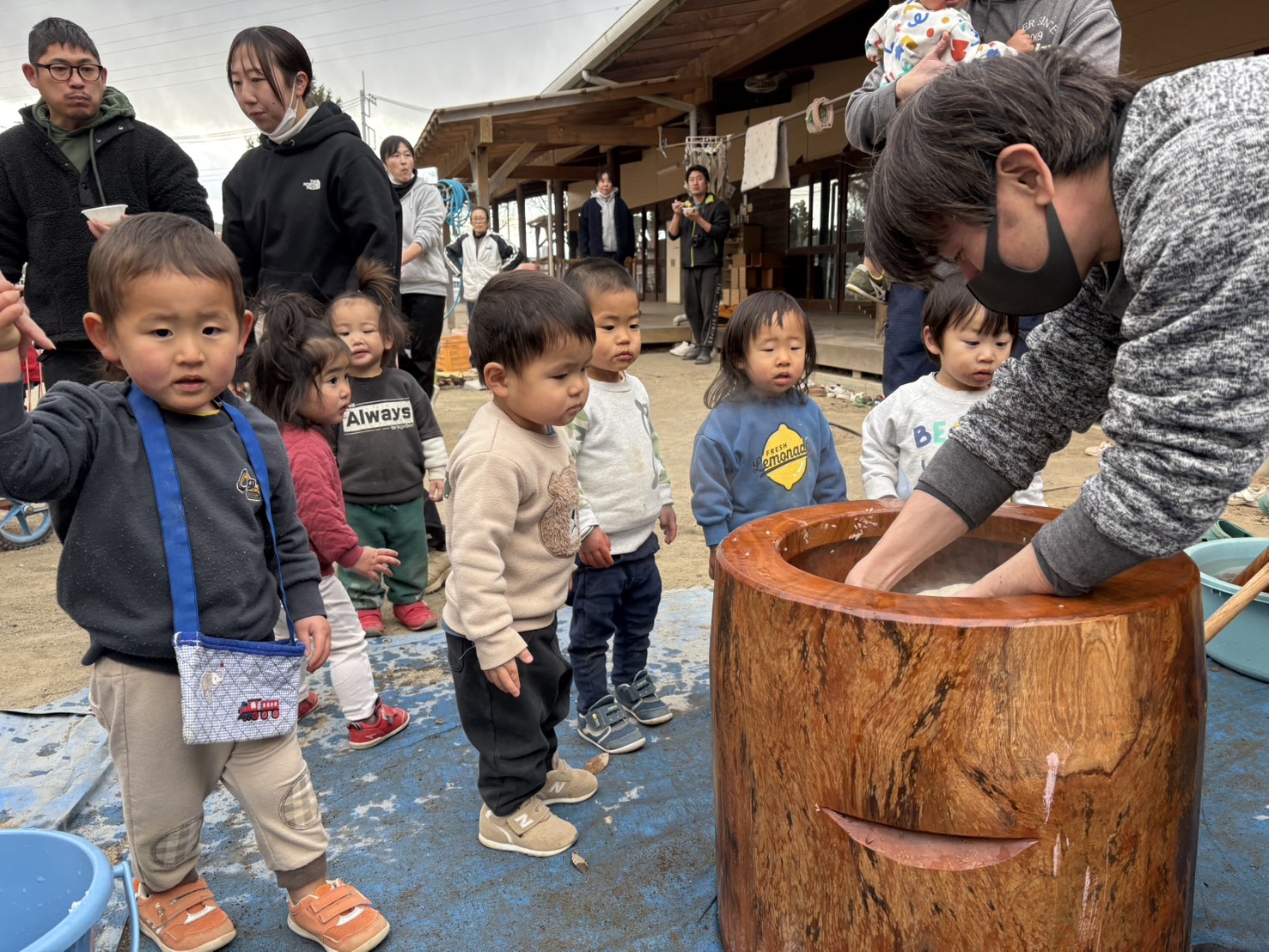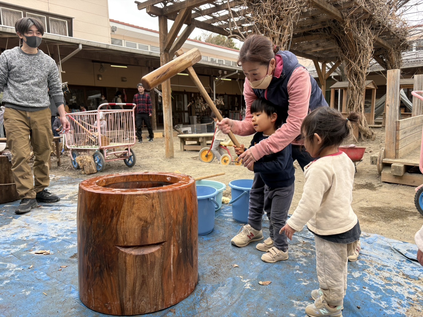 お父さんや担任たちが、お餅をぺったん!とつく様子を見ていると、やりたりたくなって、大きい子から小さい子たちまで、つかせてもらいました!